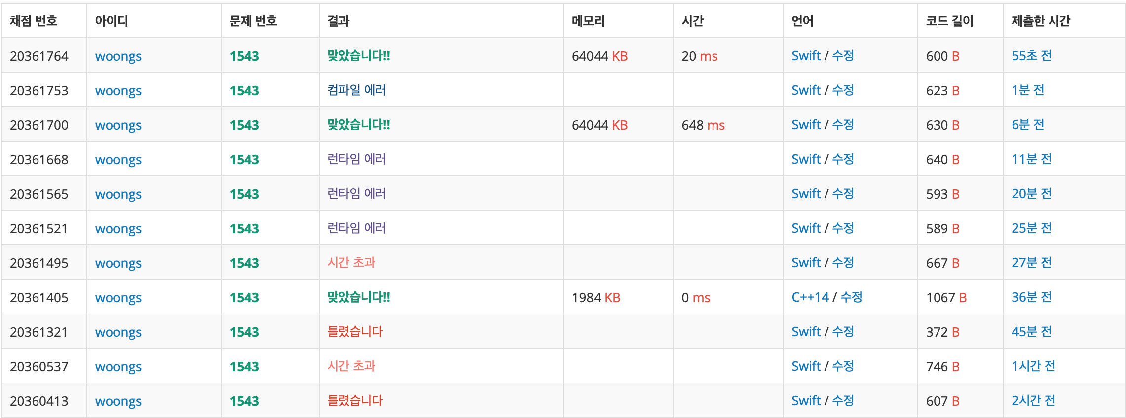Swift의 취약점인 String을 다루는 문제이기 때문에 어떻게 푸냐에 따라서 시간 차이가 매우 심하게 날 수 있습니다.
