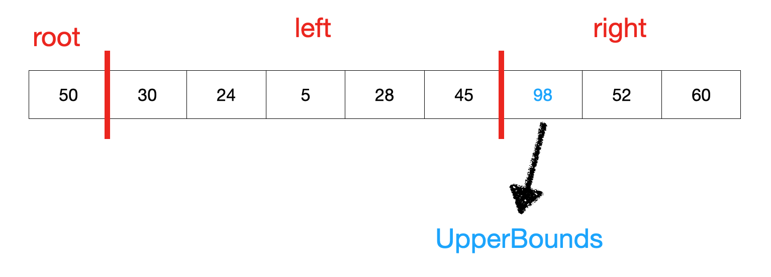 root+1 부터 처음으로 root보다 큰 값이 나오는 위치까지가 Left
