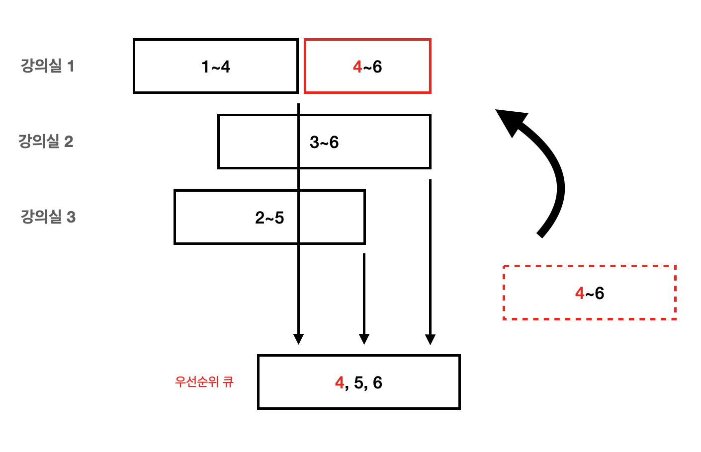 생성된 강의실들 중에서 가장 빨리 끝나는 강의실과 수업의 시작시간을 비교해서 시작이 가능하다면 그 강의실에 배정합니다.