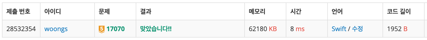 let n = Int(readLine()!)! var map = [[Int]]() for _ in 0..<n { map.append(readLine()!.split(separator: " ").map { Int(String($0))! }) } enum Direction: Int { case horizontal = 0 case vertical case diagonal } typealias Point = (r: Int, c: Int) typealias Pipe = (Point, Point) func direction(_ pipe: Pipe) -> Direction { if pipe.0.r == pipe.1.r, abs(pipe.0.c - pipe.1.c) == 1 { return .horizontal } else if pipe.0.c == pipe.1.c, abs(pipe.0.r - pipe.1.r) == 1 { return .vertical } else { return .diagonal } } func next(_ pipe: Pipe) -> [Pipe] { var nextPipes = [Pipe]() let dir = direction(pipe) if dir == .horizontal || dir == .diagonal { if 0..<n ~= pipe.1.c+1, map[pipe.1.r][pipe.1.c+1] != 1 { nextPipes.append(Pipe(pipe.1, (pipe.1.r, pipe.1.c+1))) } } if dir == .vertical || dir == .diagonal { if 0..<n ~= pipe.1.r+1, map[pipe.1.r+1][pipe.1.c] != 1 { nextPipes.append(Pipe(pipe.1, (pipe.1.r+1, pipe.1.c))) } } if 0..<n ~= pipe.1.r+1, 0..<n ~= pipe.1.c+1, map[pipe.1.r+1][pipe.1.c] != 1, map[pipe.1.r][pipe.1.c+1] != 1, map[pipe.1.r+1][pipe.1.c+1] != 1 { nextPipes.append(Pipe(pipe.1, (pipe.1.r+1, pipe.1.c+1))) } return nextPipes } var dpMap = [[[Int]]](repeating: [[Int]](repeating: [Int](repeating: -1, count: 3), count: n), count: n) func move(_ pipe: Pipe) -> Int { let dir = direction(pipe).rawValue guard dpMap[pipe.1.r][pipe.1.c][dir] == -1 else { return dpMap[pipe.1.r][pipe.1.c][dir] } dpMap[pipe.1.r][pipe.1.c][dir] = 0 if pipe.1.r == n-1, pipe.1.c == n-1 { dpMap[pipe.1.r][pipe.1.c][dir] = 1 return dpMap[pipe.1.r][pipe.1.c][dir] } for p in next(pipe) { dpMap[pipe.1.r][pipe.1.c][dir] += move(p) } return dpMap[pipe.1.r][pipe.1.c][dir] } print(move(((0,0), (0,1))))배운점