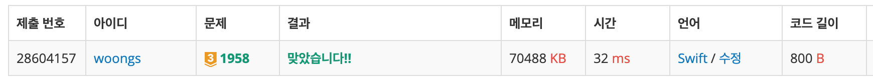 func lcs(_ strA: [Character], _ strB: [Character], strC: [Character]) -> Int { var table = [[[Int]]](repeating: [[Int]](repeating: [Int](repeating: 0, count: strC.count+1), count: strB.count+1), count: strA.count+1) for a in 1...strA.count { for b in 1...strB.count { for c in 1...strC.count { if strA[a-1] == strB[b-1], strA[a-1] == strC[c-1] { table[a][b][c] = table[a-1][b-1][c-1]+1 } else { table[a][b][c] = max(table[a-1][b][c], table[a][b-1][c], table[a][b][c-1]) } } } } table[strA.count][strB.count][strC.count] }문제는 여기까지지만, 이대로 끝내긴 아쉬우니 LCS 문자열을 만드는 방법까지 살펴보고 갈게요.