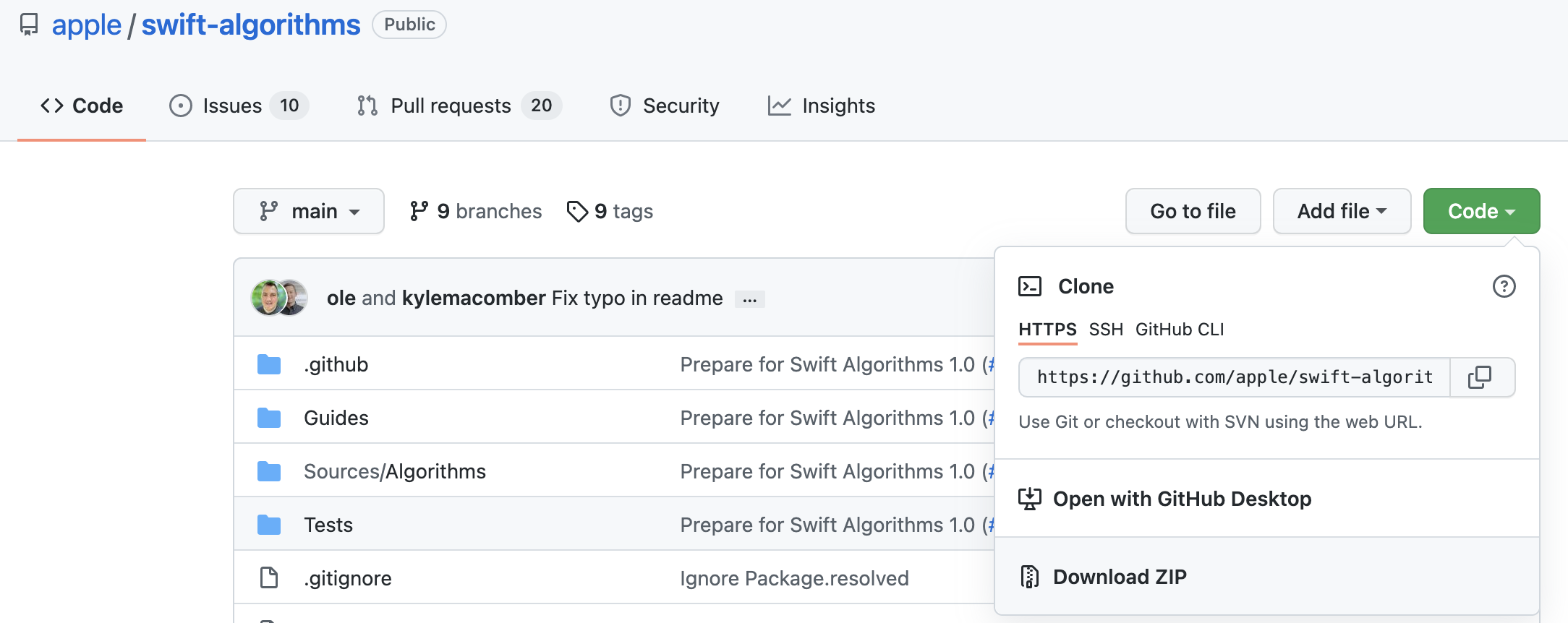 저희의 목표는 import Algorithms를 하는거기 때문에 swift algorithms 깃헙으로 가서 프로젝트를 다운받아줍니다!